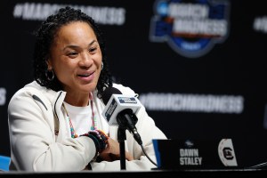 BIRMINGHAM, ALABAMA – MARCH 27: Head coach Dawn Staley of the South Carolina Gamecocks speaks during a press conference during a practice day ahead of the Sweet 16 in the Birmingham Regional of the NCAA Women’s basketball tournament at Legacy Arena at the BJCC on March 27, 2025 in Birmingham, Alabama. (Photo by Sarah Stier/Getty Images)