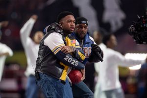 NEW ORLEANS, LOUISIANA – FEBRUARY 9: Kendrick Lamar performs with Mustard during Apple Music Super Bowl LIX Halftime Show at Caesars Superdome on February 09, 2025 in New Orleans, Louisiana. (Photo by Michael Owens/Getty Images)
