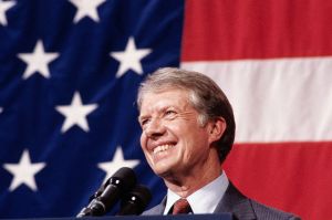 (Original Caption) 3/24/1979-Elk City, Oklahoma: Closeup of President Jimmy Carter, addressing a town meeting. American flag in background/ Getty Images