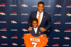 ENGLEWOOD, CO – MARCH 16: Quarterback Russell Wilson #3 of the Denver Broncos poses with his son Future Zahir Wilburn following an introductory press conference at UCHealth Training Center on March 16, 2022 in Englewood, Colorado. (Photo by Justin Edmonds/Getty Images)