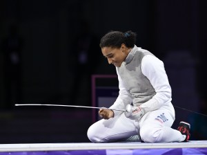Lauren Scruggs of USA reacts after defeating Arianna Errigo not shown in picture of Italy during the women’s foil team gold medal match of fencing between Italy and USA at the Paris 2024 Olympic Games in Paris, France, Aug. 1, 2024. (Photo by Zhang Hongxiang/Xinhua via Getty Images)