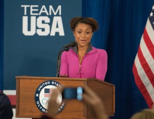 LONDON, ENGLAND – JULY 27: Retired gymnast Dominique Dawes introduces First Lady Michelle Obama at the University of East London on July 27, 2012 in London, England. Michelle Obama addressed members of the 2012 Team USA as leader of the US Olympics delegation, ahead of opening ceremony for the Olympics. (Photo by Adam Jacobs/Getty Images)