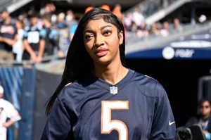 CHICAGO, ILLINOIS – OCTOBER 06: Angel Reese of the Chicago Sky looks on before the game between the Carolina Panthers and the Chicago Bears at Soldier Field on October 06, 2024 in Chicago, Illinois. (Photo by Quinn Harris/Getty Images)