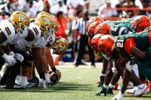 TALLAHASSEE, FLORIDA – SEPTEMBER 27: A general view of the Alabama States Hornets at the line of scrimmage against the Florida A&M Rattlers during the first half of the game at Bragg Memorial Stadium on Ken Riley Field on September 27, 2025 in Tallahassee, Florida. The Hornests defeated the Rattlers 42 to 14. (Photo by Don Juan Moore/Getty Images)