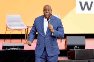 LOS ANGELES, CALIFORNIA – JUNE 13: Magic Johnson speaks during When We All Vote Inaugural Culture Of Democracy Summit on June 13, 2022 in Los Angeles, California. (Photo by Kevin Winter/Getty Images)