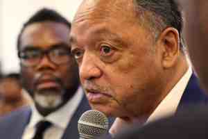 CHICAGO, ILLINOIS – MARCH 17: Chicago mayoral candidate Brandon Johnson (L) listens as Rev. Jesse Jackson announces his support for Johnson at the Rainbow/PUSH Coalition headquarters on March 17, 2023 in Chicago, Illinois. Johnson, a Cook County commissioner, is facing former Chicago Public Schools CEO Paul Vallas in a runoff election for the Mayor’s office scheduled for April 4. (Photo by Scott Olson/Getty Images)