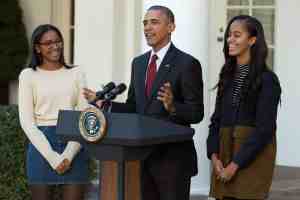 WASHINGTON, DC – NOVEMBER 25: U.S. President Barack Obama delivers remarks with his daughters Sasha (L) and Malia during the annual turkey pardoning ceremony in the Rose Garden at the White House November 25, 2015 in Washington, DC. In a tradition dating back to 1947, the president pardons a turkey, sparing the tom — and his alternate — from becoming a Thanksgiving Day feast. This year, Americans were asked to choose which of two turkeys would be pardoned and to cast their votes on Twitter. (Photo by Chip Somodevilla/Getty Images)