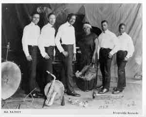 CHICAGO – 1923: “Mother of the Blues” Ma Rainey and her band the Rabbit Foot Minstrels L-R: Ed Pollock, Albert Wynn, Thomas A. Dorsey, Ma (Gertrude) Rainey, Dave Nelson and Gabriel Washington pose for a portrait in 1923 in Chicago, Illinois. (Photo by Michael Ochs Archives/Getty Images)