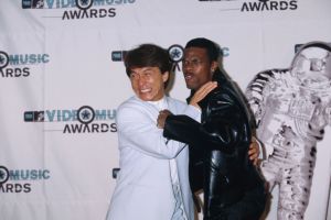 Hong Kong martial artist, actor and film director Jackie Chan, wearing a white suit, and American comedian and actor Chris Tucker, who wears a black leather jacket, in the MTV Video Music Awards press room, at the Gibson Amphitheater in Los Angeles, California, 10th September 1998. The pair, stars of ‘Rush Hour’, presented the ‘Best Video from a Film’ award at the ceremony. (Photo by Vinnie Zuffante/Getty Images)