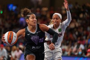 COLLEGE PARK, GEORGIA – JULY 29: Veronica Burton #22 of the Golden State Valkyries passes the ball with Jordin Canada #3 of the Atlanta Dream trying to block during a game between Golden State Valkyries and Atlanta Dream at Gateway Center Arena on July 29, 2025 in College Park, Georgia. NOTE TO USER: User expressly acknowledges and agrees that, by downloading and or using this photograph, User is consenting to the terms and conditions of the Getty Images License Agreement. (Photo by Andrew J. Clark/ISI Photos/ISI Photos via Getty Images)