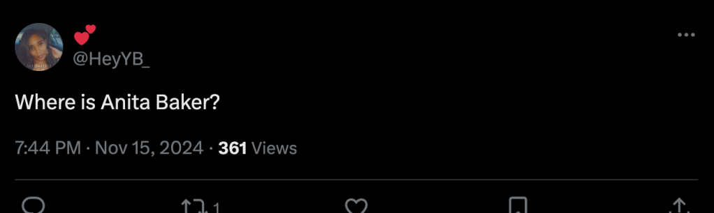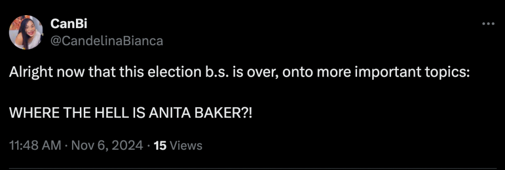 The quiet storm singer is usually active on X, reposting and engaging with her followers. The last post from Baker was on Sept 13 where she reposted a fan singing along to “Rhythm of Love.”